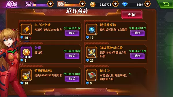 5、购买补充液 平民玩家等级提高了以后,后期等级提升缓慢,就需要通过不断地扫荡来获取经验。但是电力肯定不够用的,因此平民玩家可以在道具商店中购买电力补充液,V4以下推荐每天买完,这样子才能跟上大佬的步伐,要知道等级才是王道。