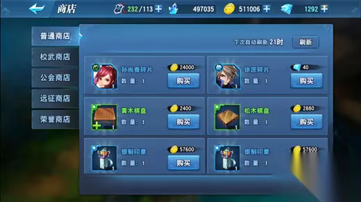 7、商店 商店会定时刷新一些武将的碎片,可以根据自身的需要进行购买,不过刷可能会出现不同的武将,对于那些没有积累了一定碎片的武将可用性不高。