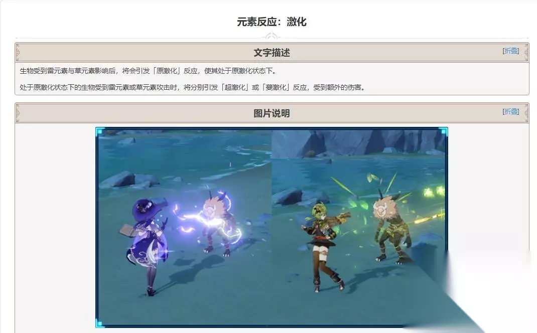《原神》3.0激化反应效果一览 激化反应共分为三种,分别是原激化、超激化和蔓激化。蔓/超激化反应本身并无内置CD,但受限于元素附着CD。蔓/超激化反应频率的具体表现与剧变、增幅反应大致相同。接下来将详细讲解每一种激化的具体表现。 1.原激化反应 表现:当雷(草)附着元素接触草(雷)附着元素时,将会触发原激化。原激化持续时间与草元素附着量有关。处于原激化状态的怪物,身上会有明显的动画效果,具体表现为绿色的电弧。 分析:原激化反应并非雷与草的和平共处,而是会消耗一定的雷元素和草元素,并重新生成一定量的草元素作为原激化状态的留存计时器。注意,一次原激化最大持续时间通常为10秒,保持雷草共存状态下一次触发原激化的时间为5秒。处于闪烁状态的草元素与雷元素反应时会同时消失,之后会重新生成草元素,由此产生的原激化状态持续时间要远短于正常情况下触发的激化持续时间,约为5秒。注意,原激化反应并非雷草共存状态。 2.蔓激化反应 表现:处于原激化状态时,一旦继续附着草元素,就会触发蔓激化反应,使该次伤害的基础伤害增加,基础伤害增加的部分可以享受全部增益。经测试,90级角色0精通时蔓激化反应增加的基础伤害约为1808(1447*1.25)。蔓激化反应的具体表现为草元素单独附着状态,并非雷草共存状态。原激化状态是否结束不能通过雷元素附着进行判断。 3.超激化反应 表现:处于原激化状态时,一旦继续附着雷元素,就会触发超激化反应,使该次伤害的基础伤害增加,基础伤害增加的部分可以享受全部增益。经测试,90级角色0精通时蔓激化反应增加的基础伤害约为1664(1447*1.15)。超激化反应的具体表现为雷草共存状态。当草元素消失时原激化状态结束,之后无法触发超激化反应。 猜测:超激化和蔓激化反应会互相限制吗?实际测试时,无法通过肉眼辨别。但是通过单独分析超激化与蔓激化反应,可以初步判断这两种反应不会互相限制。超激化和蔓激化的触发条件仅与相应的元素的附着以及原激化状态有关,并非常规意义上的两种元素互相消耗互相反应。三种激化反应中,只有原激化才是传统意义上的元素反应。经验表明,雷元素为更容易消失的一方,作为前台元素理论上效果更佳。