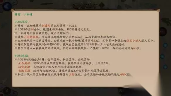 1.活动时间: 每天17:00-22:00可发现,22:00-23:00不能发现新蜘蛛,但可以挑战旧蜘蛛,自己发现的蜘蛛不计入每日次数,即:你当天除了自己发现的蜘蛛以外,还可以打一次别人发现的 2.奖励结算: 奖励结算分为两部分,一个是小纸人给的奖励,在击败蜘蛛界面的红达摩中获得,通常是体力、挑战券、突破券、厕纸,蓝白蛋,还有少量的蓝票/现世券(如有不足欢迎补充) 还有一个是击败蜘蛛的奖励,从邮箱领取。如果蜘蛛没被消灭,奖励金币很少,如果蜘蛛被消灭,按照你造成的伤害结算奖励。伤害低于三万的情况下,会获得少量个人勋章+寮勋章+少量金币+红蛋+黑蛋碎片。伤害达到三万之后,会获得大量个人勋章+寮勋章+金币(与你造成伤害有关),大概在伤害达到200万的时候,金币获得数封顶,为六万,除了普通奖励黑蛋碎片,白蛋碎片、红蛋等之外还有特殊奖励,包括黑蛋、、高星结界卡、三星白蛋、四星白蛋、蓝票等 什么阵容能拿到更高奖励:这里我推荐输出用狗鸟之类的aoe,或者爆伤茨木,也可以加入镰鼬兔子,来加快输出的行动条,保证一回合清掉小蜘蛛。小蜘蛛有轮入道,而且触发几率相当高,它们的行动浪费了大量时间,能够快速消灭小蜘蛛,就意味着我们的时间不会大量被无意义的消磨掉,就有更多的精力输出大蜘蛛。 我用的阵容是辉夜,桃花,鸟,狗,丑女(四星,御魂强化了一个生命位),鸟狗两个aoe能打死四只小蜘蛛,中间那个血厚打不死,但是已经很快了,如果丑女五星,不会被秒的话,桃花其实换老头更好。 推荐大家用供火+aoe+第二个aoe/爆伤茨木+拉条/丑女/酒吞+奶(桃花/老头/花鸟/六星椒图)的阵容,至于麒麟中的鬼王酒吞,我不太推荐酒吞作为唯一输出来打蜘蛛。在太多人打蜘蛛的情况下,酒吞打小蜘蛛很慢,小蜘蛛轮入道耗费大量时间,导致总伤害较低,最可怕的是中间的小蜘蛛有媚妖/魍魉,如果混乱了酒吞,真的是瞬间爆炸 但是有一种情况可以用酒吞很快的打出更高伤害,在你没有aoe,只让单体打大蜘蛛的情况下,不要打死第一轮出现的所有小蜘蛛,留下一只,就可以让酒吞安心打伤害了,只不过结算小纸人奖励会少一些。