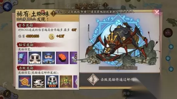 阴阳师土蜘蛛副本打法技巧攻略,土蜘蛛boss可以集结好友,附近的人,寮里的一起打,也可以独自挑战,战斗界面左方有个集结按键,可集结附近、好友、阴阳寮成员一起打。