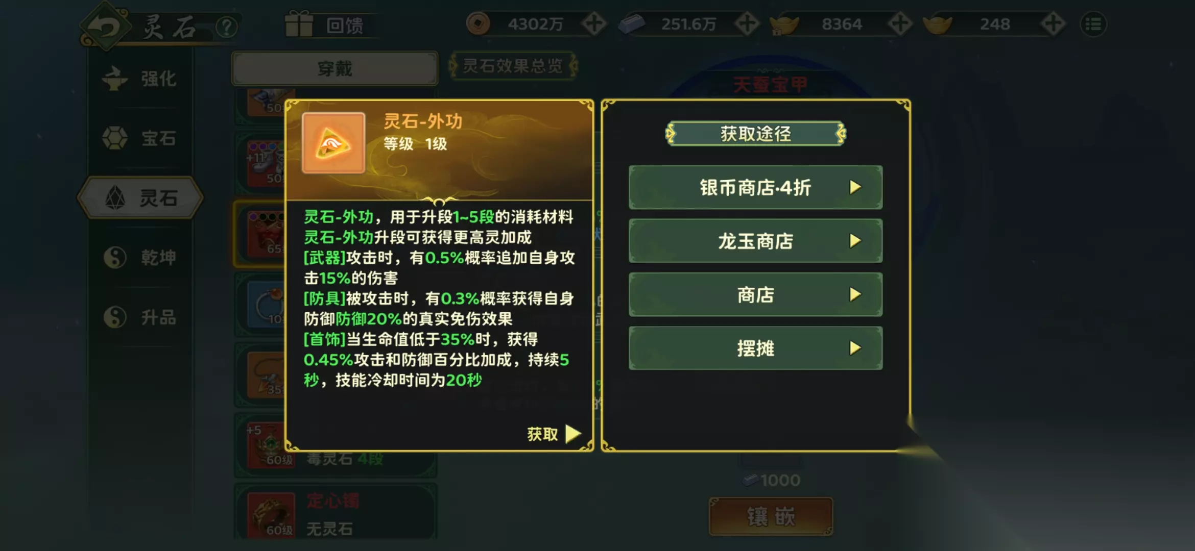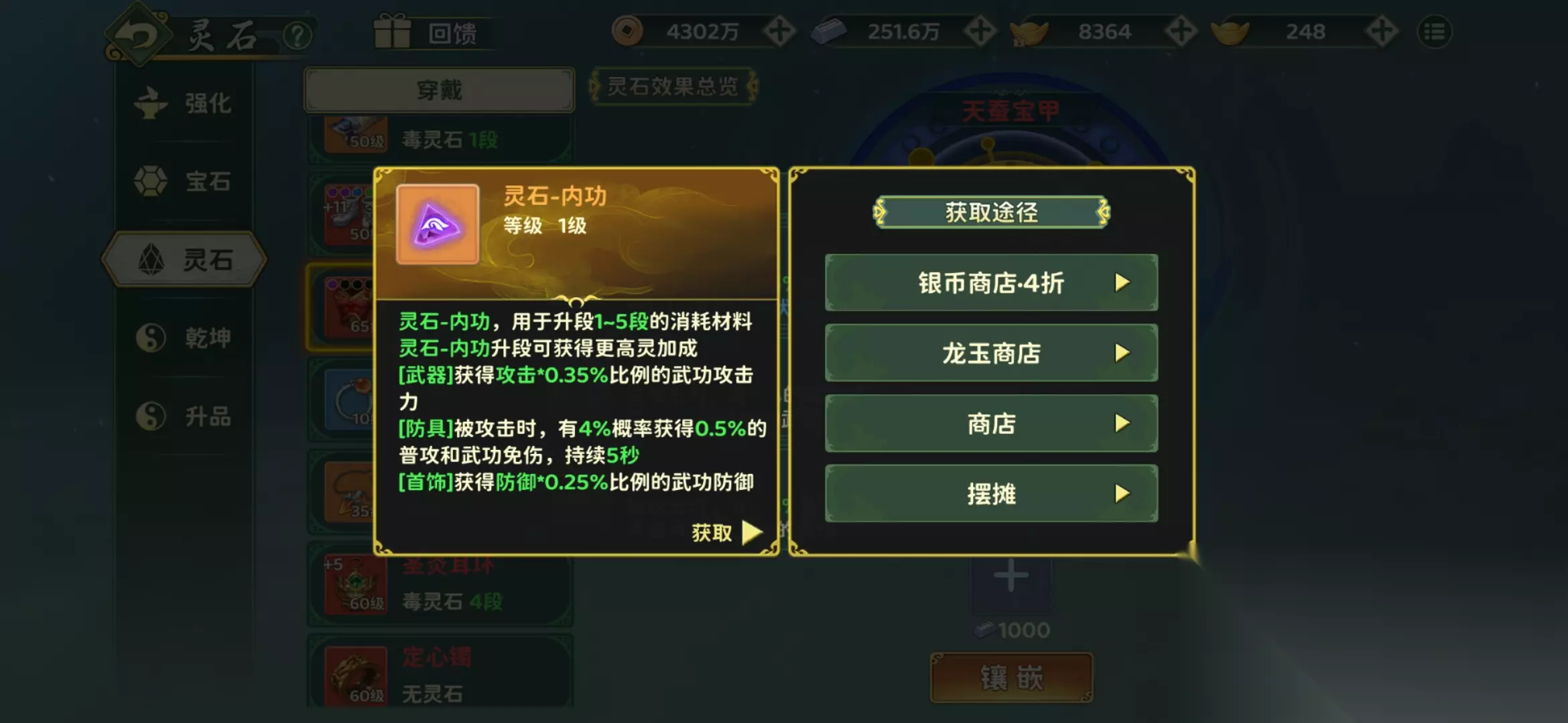 灵石 — 内功: 搭配弓手、医师【防具】时,当被攻击,有 4% 概率获得 0.5% 的普攻和武功免伤,持续 5 秒,有效的提高了生存; 而获得攻击 * 0.35% 比例的武功攻击力,医生作为【武器】可以提升治疗量