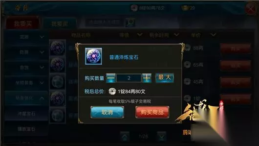 2、购买税率 装备(包含人装马装)、强化材料(包含冲星宝石、镶嵌宝石、宝石合成、品质提升等)、副将、杂货等商品每笔交易收取5%的银子交易税。买方用金子购买银子,获得的银子会被征收8%的交易税。