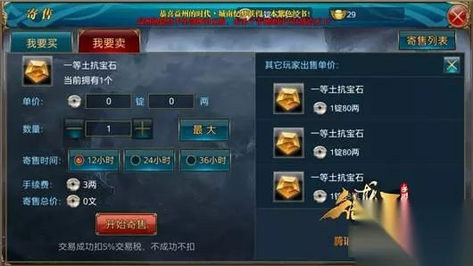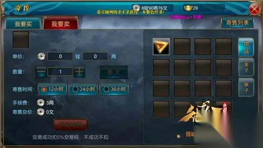 2、寄售种类及税率 可以寄售所有包裹未绑定装备(包含人装马装)、强化材料(包含冲星宝石、镶嵌宝石、宝石合成、品质提升等)、副将、杂货等商品,同时可寄售金子银子。 物品扣除5%的交易税,卖方上架金子,收到的银子会被征收8%的交易税,所有税都是交易成功后才会扣除,不成功不扣。银子交易不扣除税。所有物品寄售都收取3两手续费。