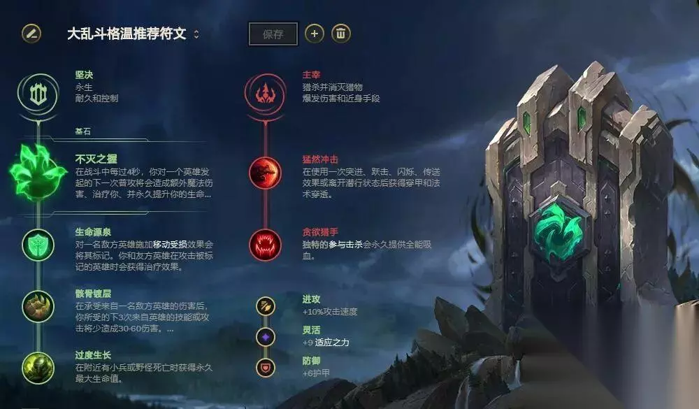大乱斗格温推荐符文 主系符文:不灭之握+生命源泉+骸骨镀层+过度生长 副系符文:猛然冲击+贪欲猎手 符文解析:格温是近战AP,不灭符合格温持续作战的属性,虽然征服者更适合格温,但坚决系符文能让格温更肉。对面poke阵容时,你说触发不灭容易还是叠满征服者容易? 生命源泉配合霜火A人减速即可触发。 骸骨镀层让格温前中期面对刺客会好受点。 过度生长提高坦度。 猛然冲击增加伤害,贪欲猎手提供少量全能吸血能力。 【出装和加点】