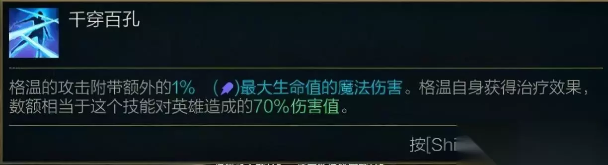 格温普攻附带最大生命值伤害,加上Q技能真实伤害(中心区域),所以和传统战士和坦克肉搏丝毫不虚。加上W技能圈外技能无法被选中,E技能加攻击距离和高额攻速,格温近战对拼能力属实不弱。