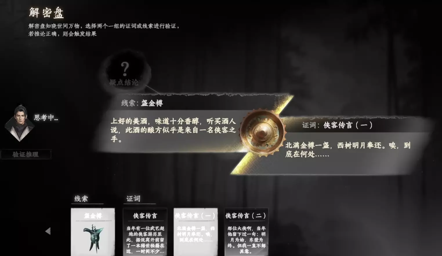 与林褚交谈完后,各位需前往(1979,1278)寻找杂货商,按林褚给的提示在杂货商这里买到盏金樽,然后在解密盘中把盏金樽与侠客传言一结合起来,并在推理结论中选择西树明月,就能推理出线索与城外那颗长得很奇怪的树有关。目标树木的位置在(1899,1232),需有避瘴珠才能前往。把此处的敌人解决后,通过交互用盏金樽浇灌西树,就能拿到最后一个线索物品明月石。