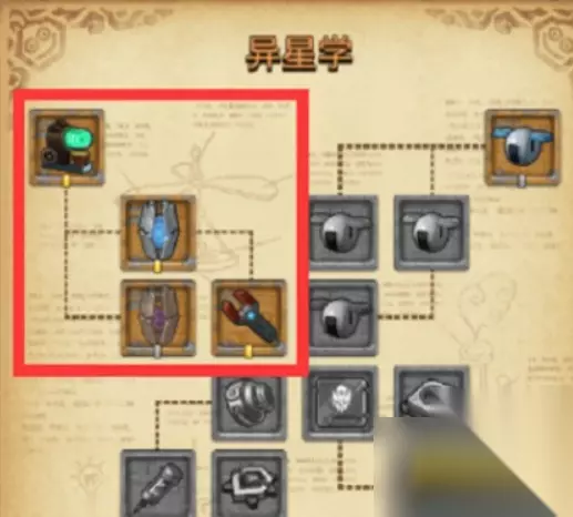 商店元件留意购买,各类建筑物留意均点选 还有永远的地刷元件也是可以的 前期主使用帝释天技能清图并穿插空艇云母弹 获得矮人博士家的异星学 点左上连携技的几率不耗体力,主云母弹清图 异星学右楼下对元件还优先点选