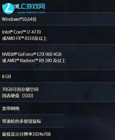 【推荐配置】 1、操作系统:Windows®10,64位 2、处理器:【Intel® Core™ i7-4770】、【AMD FX™ 8310及以上】 3、显卡:【NVIDIA® GeForce® GTX 960 4GB】、【AMD™ Radeon™ R9 280 及以上】 4、内存:8 GB 5、存储空间:70GB可用存储空间、固态硬盘(SSD) 6、网络:宽带网络 7、输入设备:带滚轮的多按钮鼠标 8、分辨率:最低显示分辨率1024x768