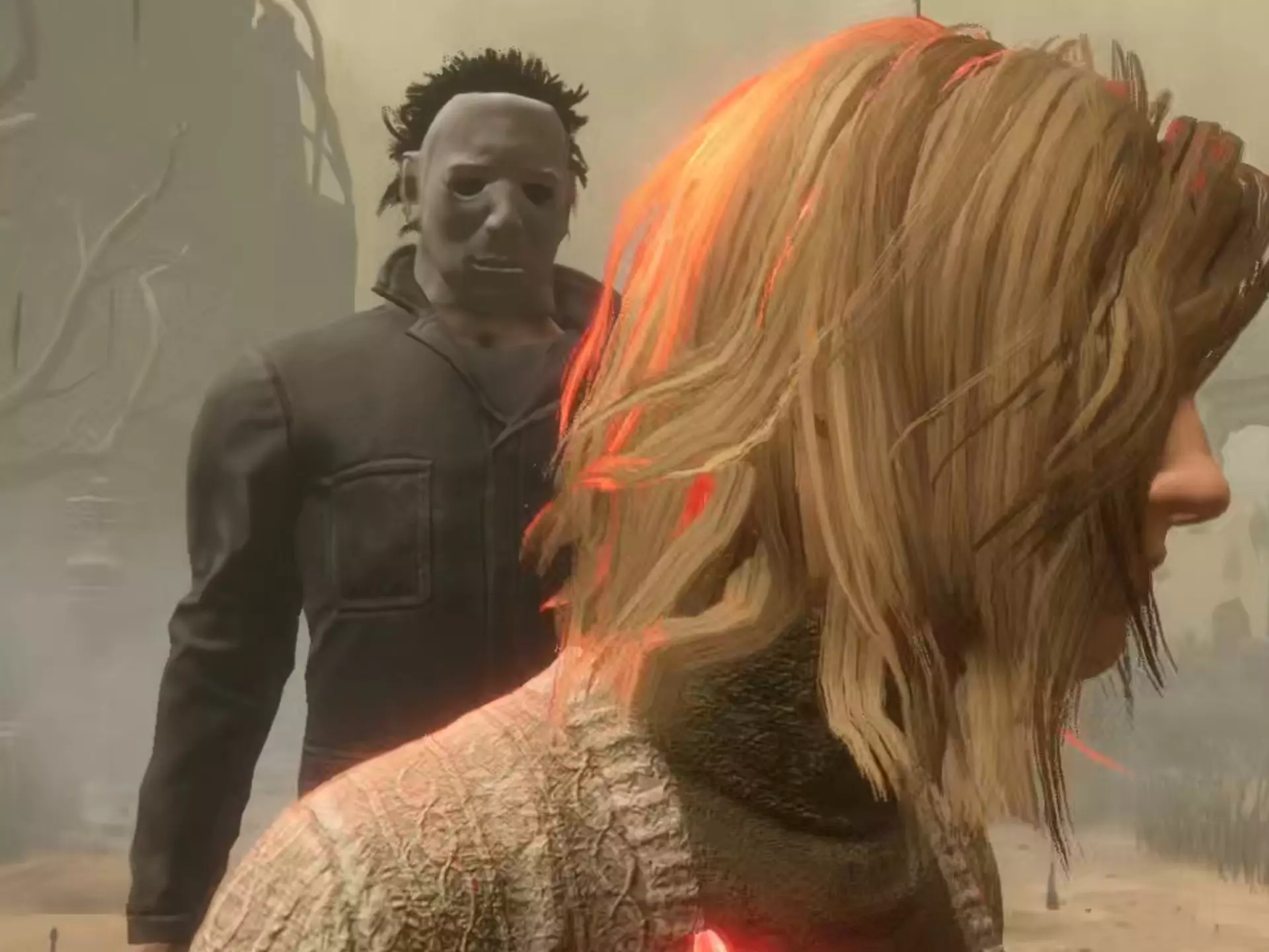 这是《黎明杀机》的游戏内容,展示了玩家操控诡异伪人杀手在阴森的游戏场景里,对逃生者展开追杀的过程,呈现了游戏里的追杀玩法与惊悚氛围。