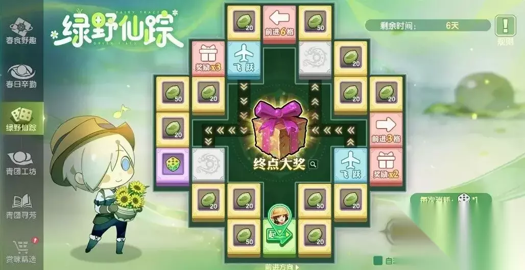 “绿野仙踪”大富翁为活动核心循环玩法。玩家消耗踏青骰子进行掷骰移动,途经格子均可获得踏青积分;抵达终点额外奖励200积分,并有机会触发特殊事件格,获取额外增益。骰子来源明确:主要通过“春食野趣”翻牌及“春日辛勤”任务获取,建议优先完成基础产出路径,保障积分持续增长。