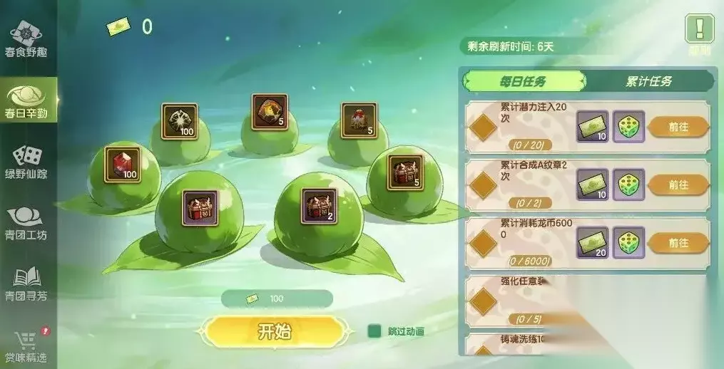 活动共设七大功能模块,结构清晰、操作直观。首推“春食野趣”翻牌玩法——无需复杂操作,每日点击即可随机获取踏青骰子、强化石、潜能原石等高频养成材料,零门槛参与,持续积累可显著缓解资源压力。