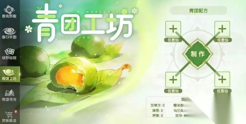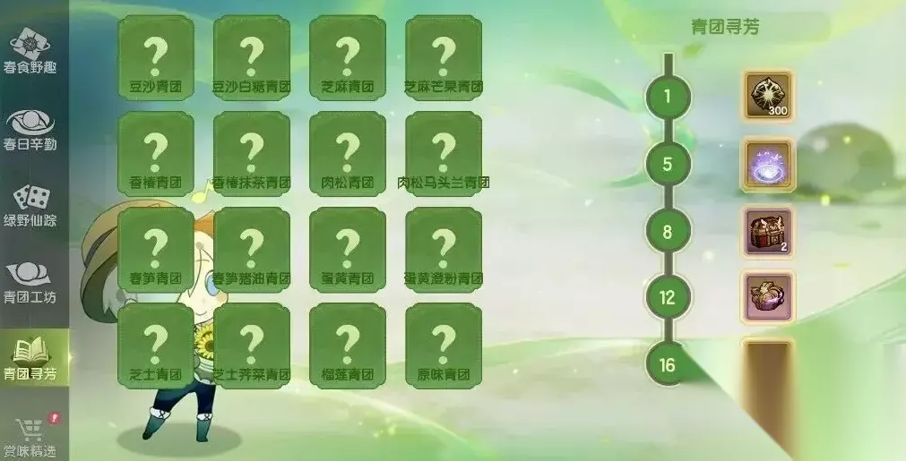 “青团寻芳”为配套兑换系统,依据玩家在“青团工坊”中成功解锁的青团种类数量,开放对应档位福利领取。两模块联动设计,形成“制作—解锁—兑换”的正向反馈链,显著提升整体资源转化效率。