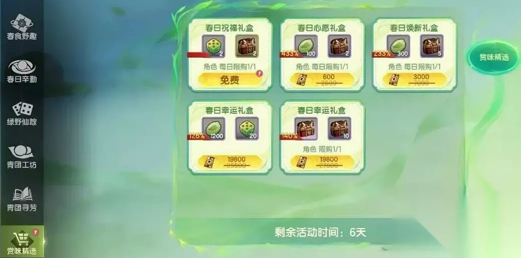 “赏味精选”提供多层次礼盒供给。每日限领一次春日祝福礼盒,内含踏青骰子与全材料随机包;同步开放多档付费礼盒,其中春日幸运礼包第二种直赠梦幻女孩时装,为外观党提供确定性获取路径。