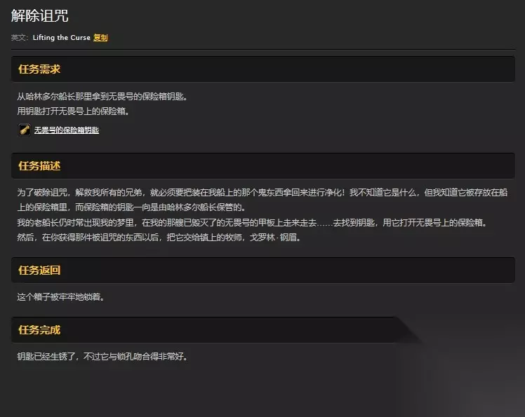 任务要求玩家找到并杀死哈林多尔船长,找到钥匙打开在水底下的保险箱。 具体内容如下: 为了破除诅咒,解救我所有的兄弟,就必须要把装在我船上的那个鬼东西拿回来进行净化! 我不知道它是什么,但我知道它被存放在船上的保险箱里,而保险箱的钥匙一向是由哈林多尔船长保管的。 我的老船长仍时常出现我的梦里,在我的那艘已毁灭了的无畏号的甲板上走来走去……去找到钥匙,用它打开无畏号上的保险箱。 然后,在你获得那件被诅咒的东西以后,把它交给镇上的牧师,戈罗林·钢眉。