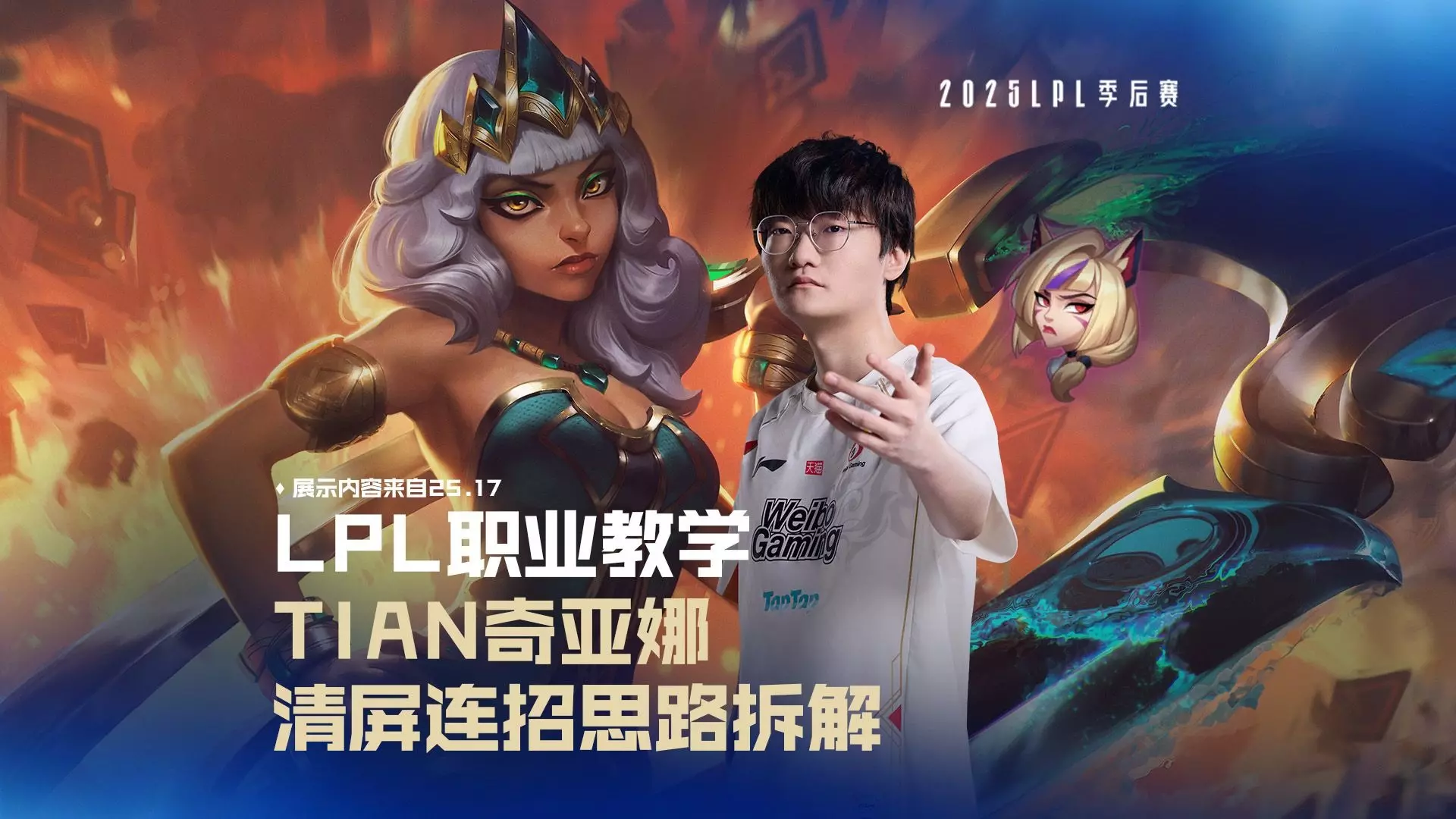 LPL职业教学:Tian亲授奇亚娜杀手锏 Tian老师小课堂开课啦!Tian亲授25.17版本奇亚娜杀手锏,教你奇亚娜元素灵活运用的秘籍,还有连招细节和大招释放…