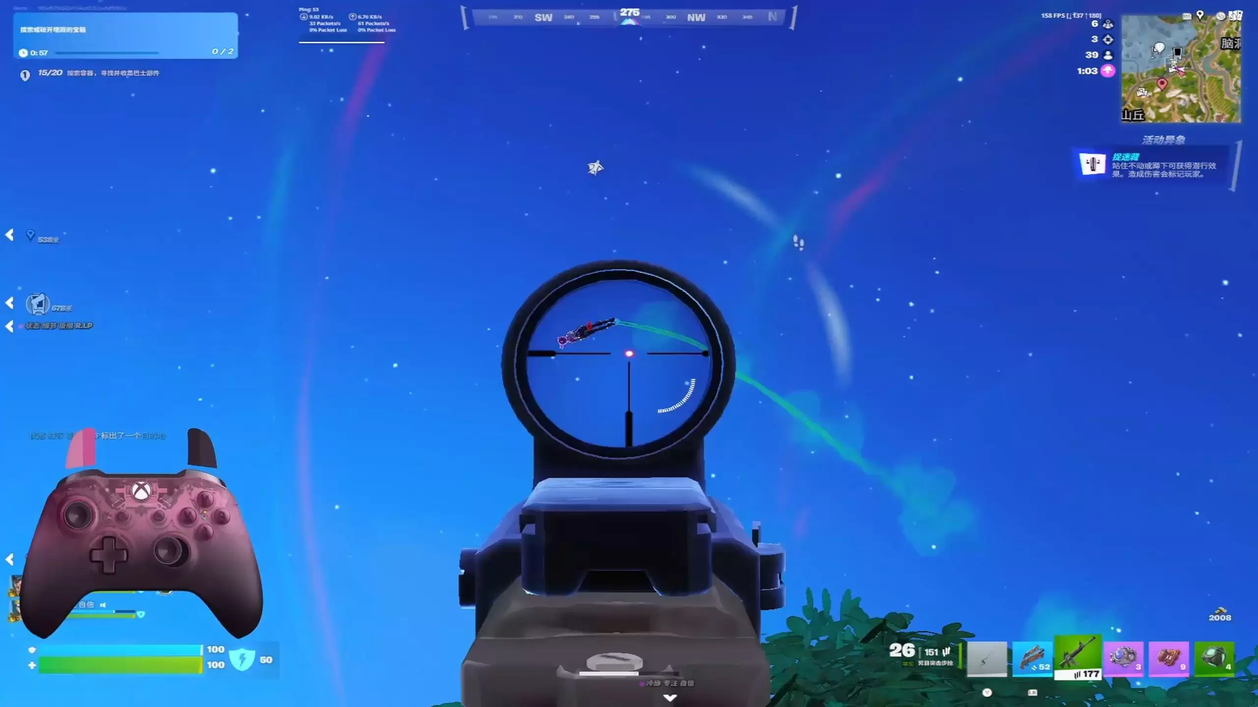 这是第一人称射击游戏《堡垒之夜》的实战对局画面,对局中玩家操作精准枪法出众,被他人误认为开启自瞄外挂,实际玩家仅使用了辅助瞄准,本文分享该堡垒之夜的对局操作画面。