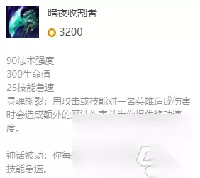 装备介绍 1、【暗夜收割者】-神话装备:+90法强、+300生命值、+25技能急速; 对敌人造成伤害时可以增加自己的移速,配合小菊的减速可以很好的黏住敌人。