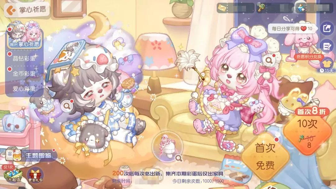 活动介绍:主题彩蛋「掌心祈愿」限时登场!彩蛋上新送福利!新彩蛋上线后可免费抽取一次,首次使用时空之钥和晶钻抽取10连还可分别享受首次8折优惠!彩蛋奖励包含晨星品质时装「小狗噗噗套装」「小兔妮妮套装」以及晨星品质家具套装「动物派对」系列等全新礼物!还有典藏品质的「熊猫潘潘套装」「小猫茉茉套装」和家具「甜蜜小猫面包店」系列,装扮单品「妮妮的蛋糕帽」「妮妮的枕头飘窗」「噗噗的收纳车」「噗噗的漫画角」等限时奖励哦!