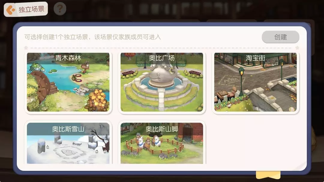 功能介绍:版本更新后,家族新增"创建临时场景"功能啦!族长/副族长可选择创建1个独立场景(该场景仅家族成员可进入),小奥比们可以一起在家族的独立场景里团建啦!