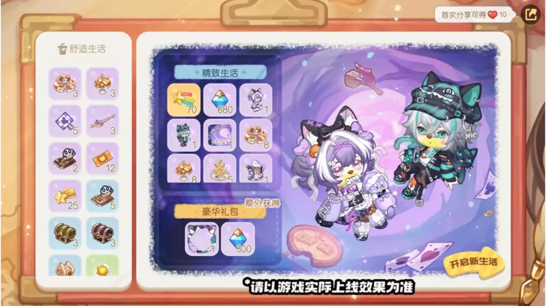 活动周期内,升级解锁精致生活礼包,立即赠送礼包等级10级。完成每日备忘,达到对应礼包等级即可解锁等级奖励,精致礼包奖励包括时装「怪趣柴郡猫套装」「潮酷柴郡猫套装」、装扮散件「格纹针织帽」「茶杯毛绒发箍」「毛绒尾巴腰挂」、家具「柴郡猫茶壶小屋」「柴郡猫茶杯灯」、背景卡「奇境隧道」及丰厚的晶钻彩蛋锤、高级彩虹星星等其他珍贵礼物。