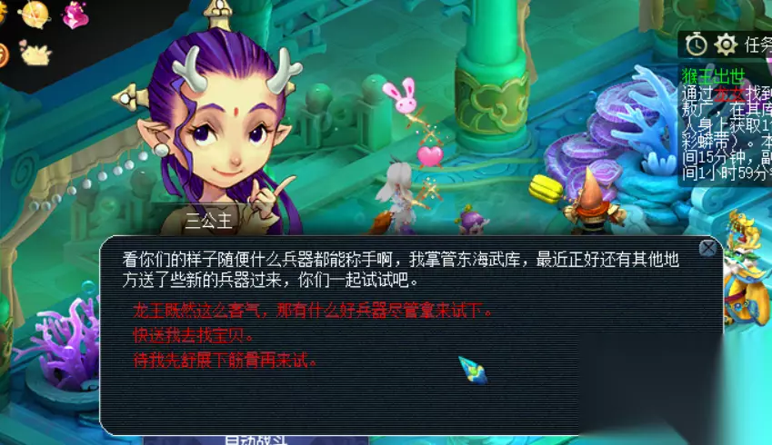 返回龙宫。与三公主,连续进行3场战斗。本环任务时间为20分钟。