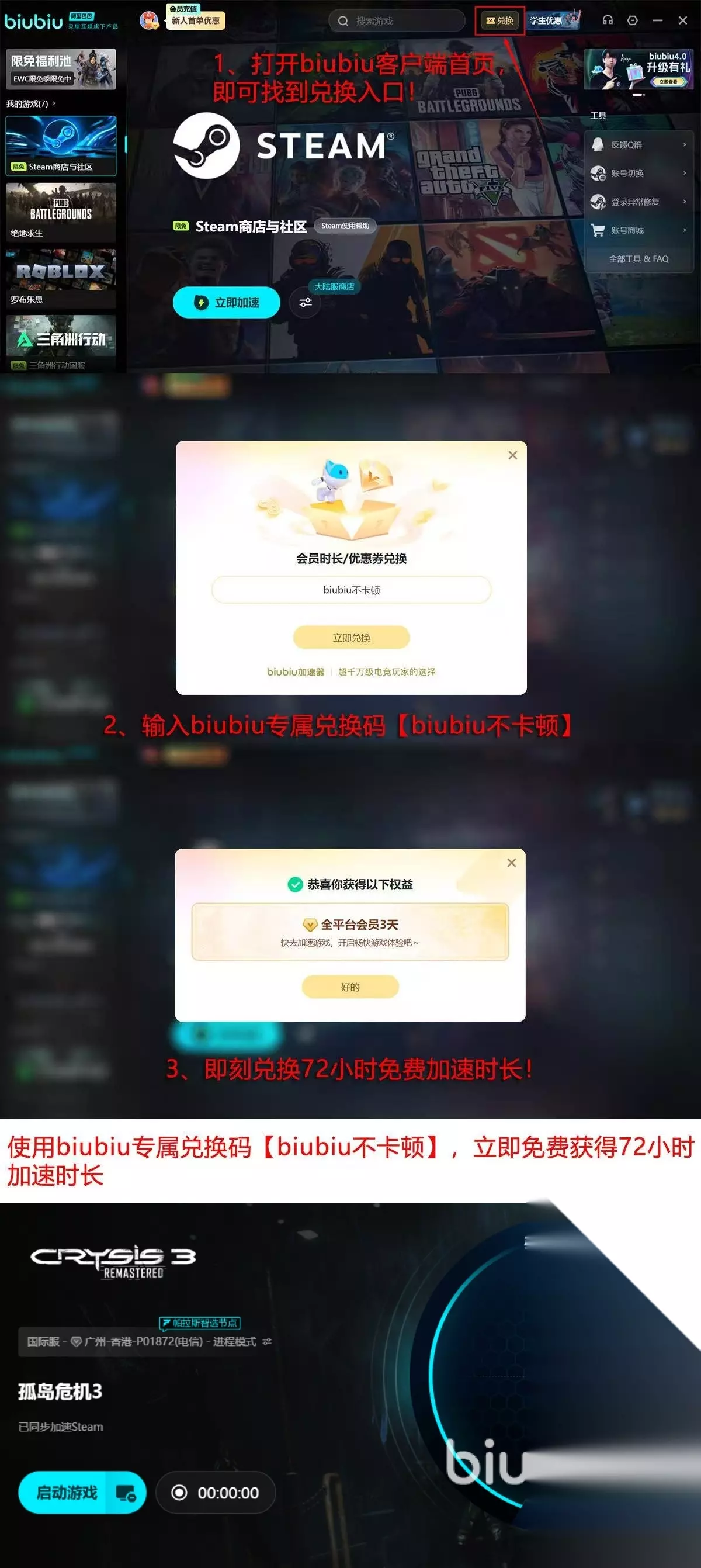 现在新用户在第一次使用这个加速器的时候是获取到不错福利。新用户在这款加速器之中可以获取到24小时的免费加速时间。使用兑换码【biubiu不卡顿】则是可以额外的获取到3天的免费加速。