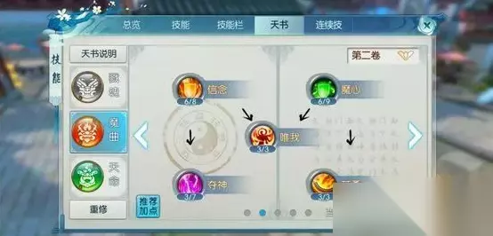 天书加点是强化技能效果的关键,对于聚灵流鬼王而言,其核心在于最大化聚灵咒的伤害与命中率。在天书第一卷中,需要点满狂魔、歃血、破空、炙热、斗志、火舞等关键节点,以显著提升真气、攻击属性并附加控制效果。第二卷则应重点投入天谴和乱舞来强化暴击率与普攻输出。第三卷的震慑、迅疾、魔煞、妄念、天翔等技能则需要根据PVP或PVE的主场景进行权衡选择,例如PVP侧重妄念提升抗性,PVE则可侧重魔煞增强群体伤害。