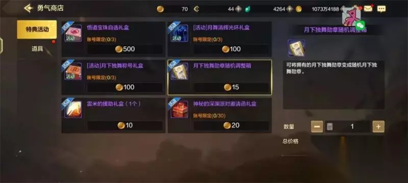 奖励礼盒里面的东西比较重要的就是灵悦币和勋章随机礼盒,勋章盒子有概率直接开出来毕业勋章。 魔法职业用月下独舞-下,物理职业用月下独舞-月,如果没开出来自己对应的,可以在勇气商店换勋章随机调整箱进行调整,直到勋章毕业。