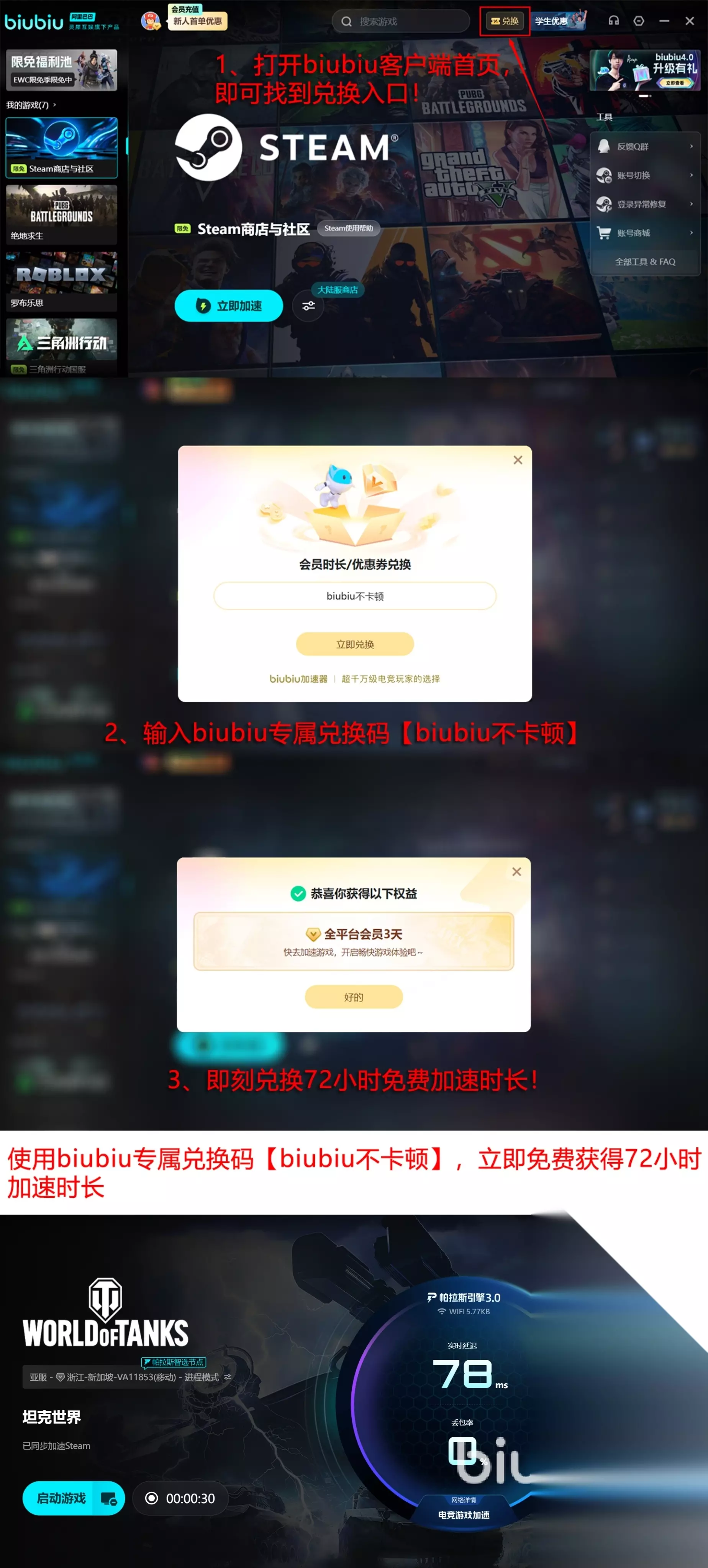 biubiu这边相当有诚意,准备了免费时长送给大家,新用户免费加速24小时;额外还有兑换码福利,输入【biubiu不卡顿】全体用户都能再领72小时。而且biubiu的游戏库挺全的,不光坦克世界,其他常玩的Steam游戏基本也都能找到。