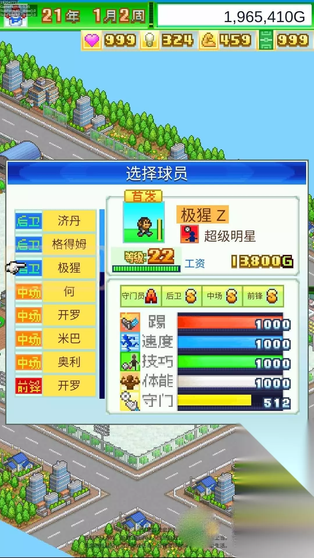 1.比赛,有联赛和奖杯赛两种,联赛有5种,依次是业余→地区→职业→世界→开罗;奖杯赛有几十种,是刷钱的主要来源。 2.特别训练,顾名思义,就是通过训练增加球员属性的地方。 3.经营俱乐部,内有四个子菜单 ①引进球员就是招募球员,球员不看属性,只看特征(大概级别为普通蓝色→领队绿色→世界级黄色→超级球星红色),最终队伍都是超级球星,只有超级球星能够快速满属性(满属性1000)。 ②地区活动就是消耗爱心点数增加新球员、教练、比赛等,大部分内容需要举办活动解锁,活动界面写明了该活动解锁什么。 ③强化设施就是强化球场边缘那些建造的设施,设施可以重复建造,而且共享上限,设施是右上角四种点数的主要来源。 4.球队编制,内有三个子菜单 ①队形,就是改变比赛队形的,初始队形可以用到最后……最后开罗子比赛建议用全攻队形;队形主要靠教练解锁,不过真没必要为了队形换教练(除了最后的开罗子教练)。 ②比赛队员,这个选项可以换队员和换队员位置;换队员办法为点该队员一下,然后点左下角队员席按钮即可打开替补界面换人;换队员位置办法为点该队员一下,然后点其他人即可换位置。 ③队员信息,看队员属性的。 5.查看信息,就是看各种游戏属性的。 6.设定系统,就是改系统设定的,只要记得8年通关后开高速模式就行。 三、快速提升攻略