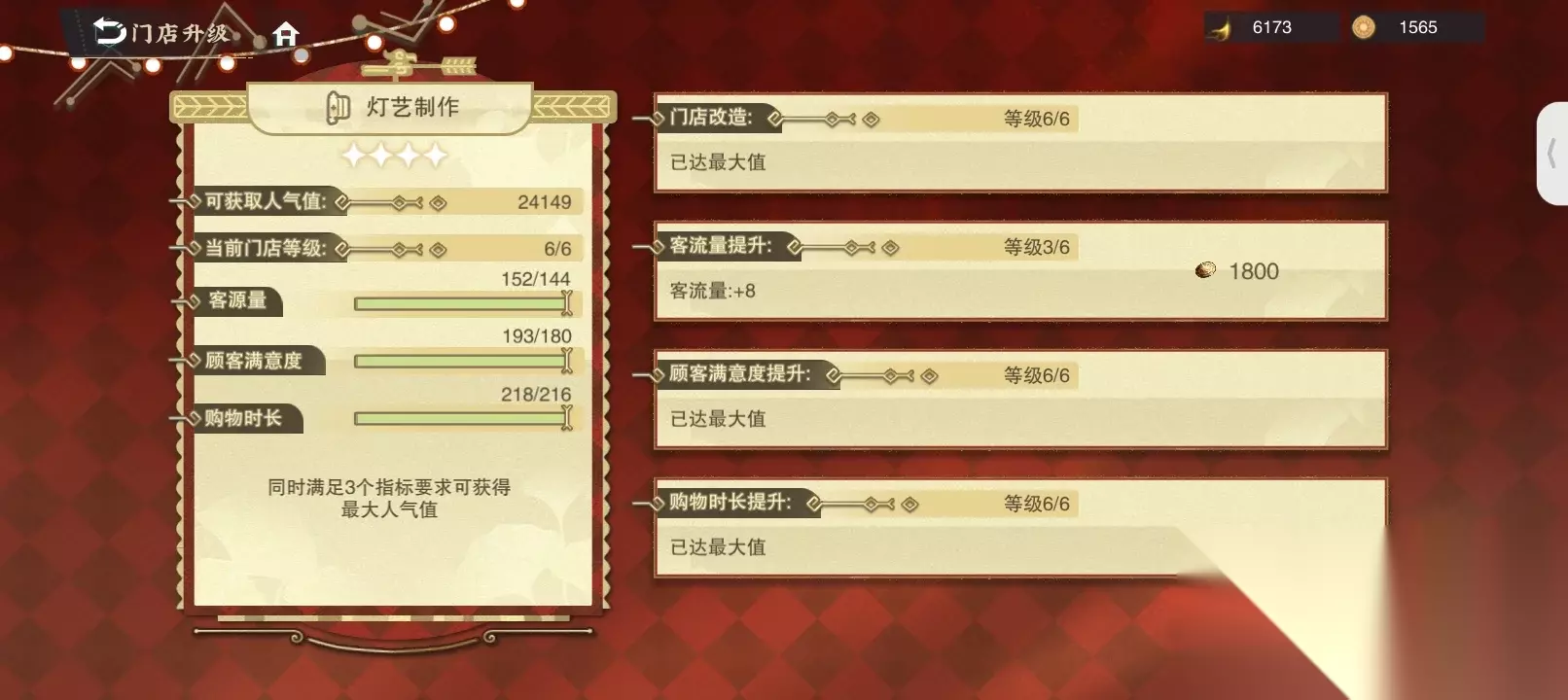 7、顾客满意度提升:6级 8、购物时长提升:6级 9、灯笼置办:客流量提升:2级