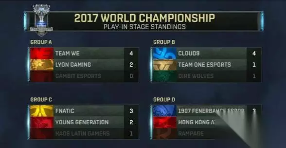 北京时间9月26日晚间,武汉体育中心体育馆,《英雄联盟》2017全球总决赛入围赛首轮竞争宣告收官。经过四个比赛日的鏖战之后,从入围赛首轮脱颖而出,从而参与到入围赛第二轮竞争的8支队伍最终决出,它们分别是A组:WE、LYN;B组:C9、ONE;C组:FNC、YG;D组:FB、HKA。