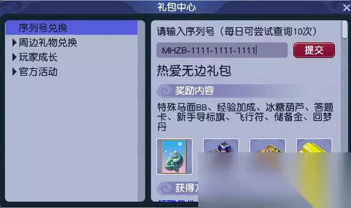 福利礼包说明 1、激活码:MHZB-1111-1111-1111属于通用激活码,每个新服、每个账号,只要满足条件即可使用(角色<50级,账号未使用过任意新手礼包); 2、该激活码与部分礼包存在互斥(包括与论坛黑熊精礼包互斥),请根据你的需要选择是否激活; 3、为避免出现礼包激活或领取失败等异常情况,请勿在防沉迷状态、体验状态或道具栏无空位状态等特殊情况下使用。