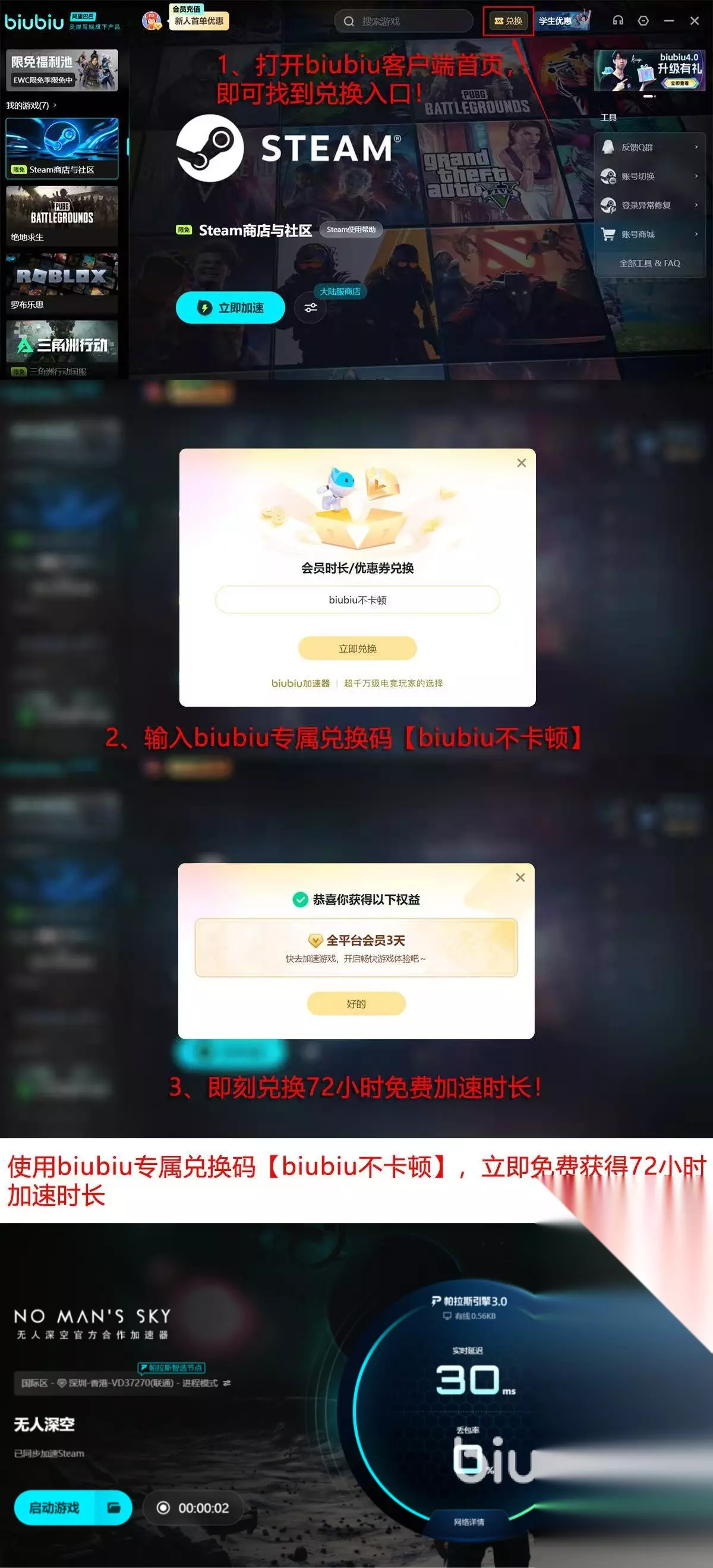 现在正是体验biubiu加速器的最佳时刻,平台特地推出新人福利:新人注册就能享受到无门槛全平台加速24小时的福利,并且输入【biubiu不卡顿】还能继续深度探索与激战72小时,这么合计下来的话新用户可享受免费加速96小时。