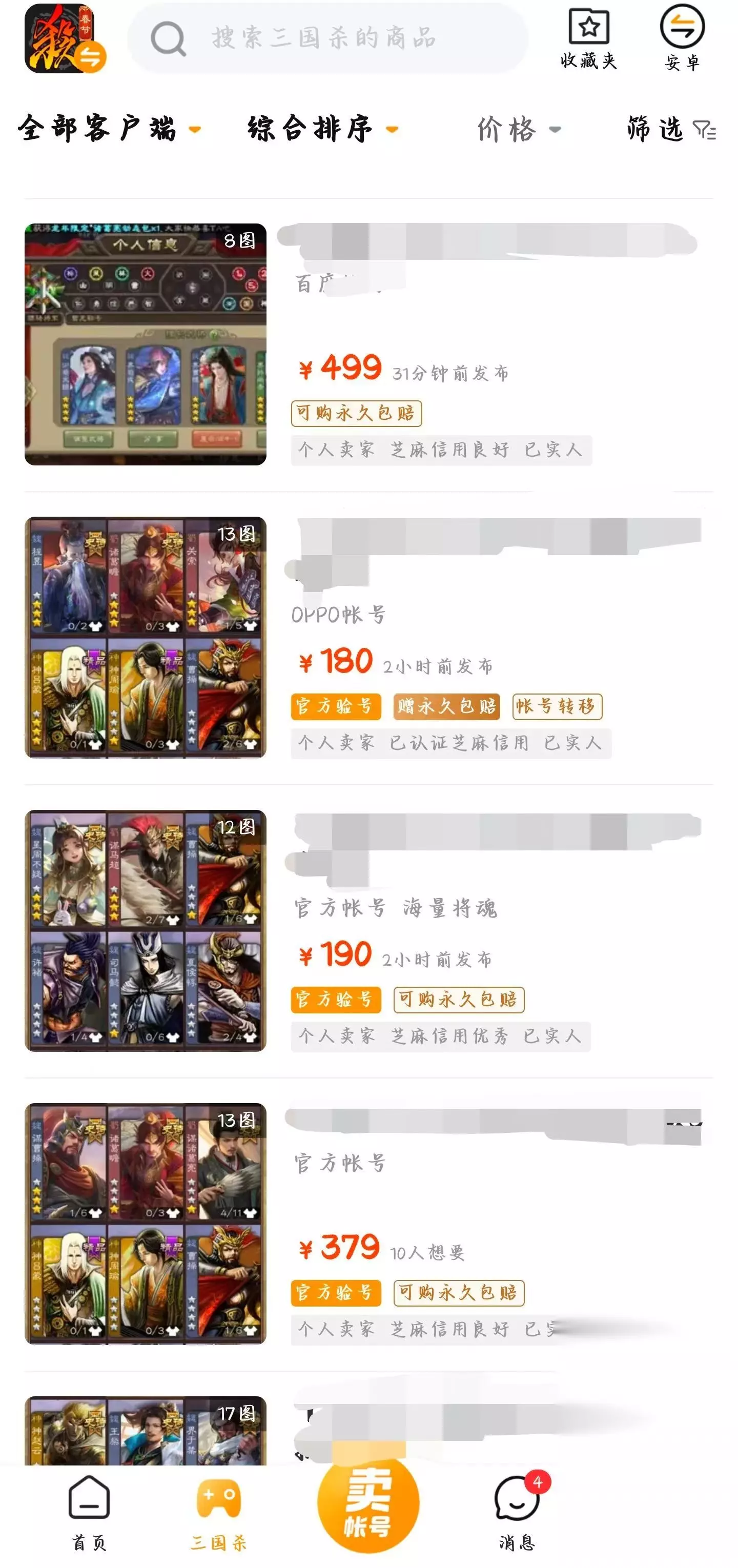 三国杀这么多年的运营,让这个游戏有了很多服务器登陆端口,且这些端口还都不互通,小伙伴可能会担心找不到合适的账号。小编这里劝大家放心,交易猫这个平台受众群体广泛,下载量庞大,不同的服务器也有很多玩家在玩,在交易猫上面交易,小伙伴根本不用担心找不到不同服务器的三国杀账号,比如华为端,oppo端,官方服务器端,在交易猫都可以找到,大家尽管把心放在肚子里。
