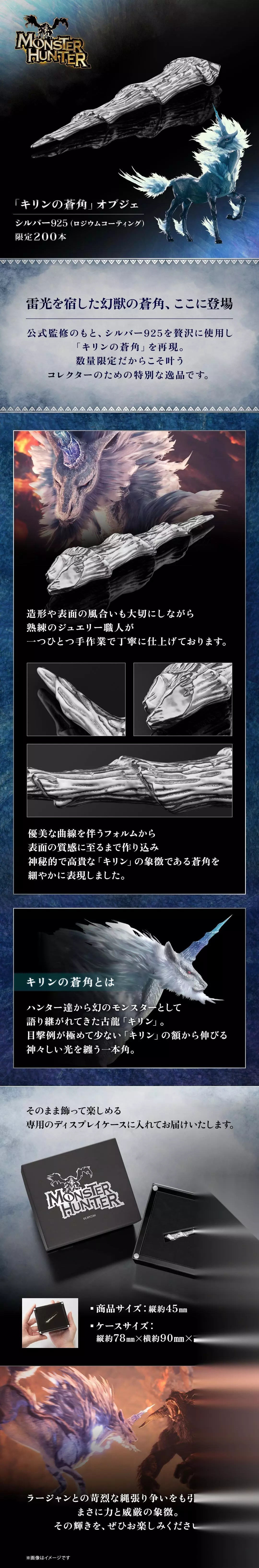 U-Treasure宣布将与“怪物猎人”系列合作推出“麒麟的苍角”饰品。售价为33000日元,限量200件。它由镀铑925银制成,并由珠宝工匠在官方监督下精心手工制作。 它将装在特制的展示盒中交付,以便作为收藏品展示。