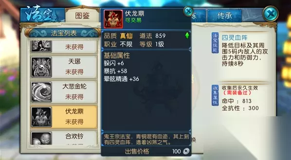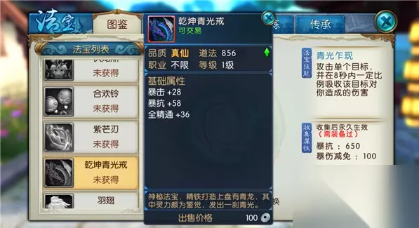 二、青光乍现 法宝解析 1、该技能是法宝【乾坤青光戒】的技能,可以攻击敌方单个目标。 2、攻击后的8秒内按照一定的比例吸收该目标对自己造成的伤害。