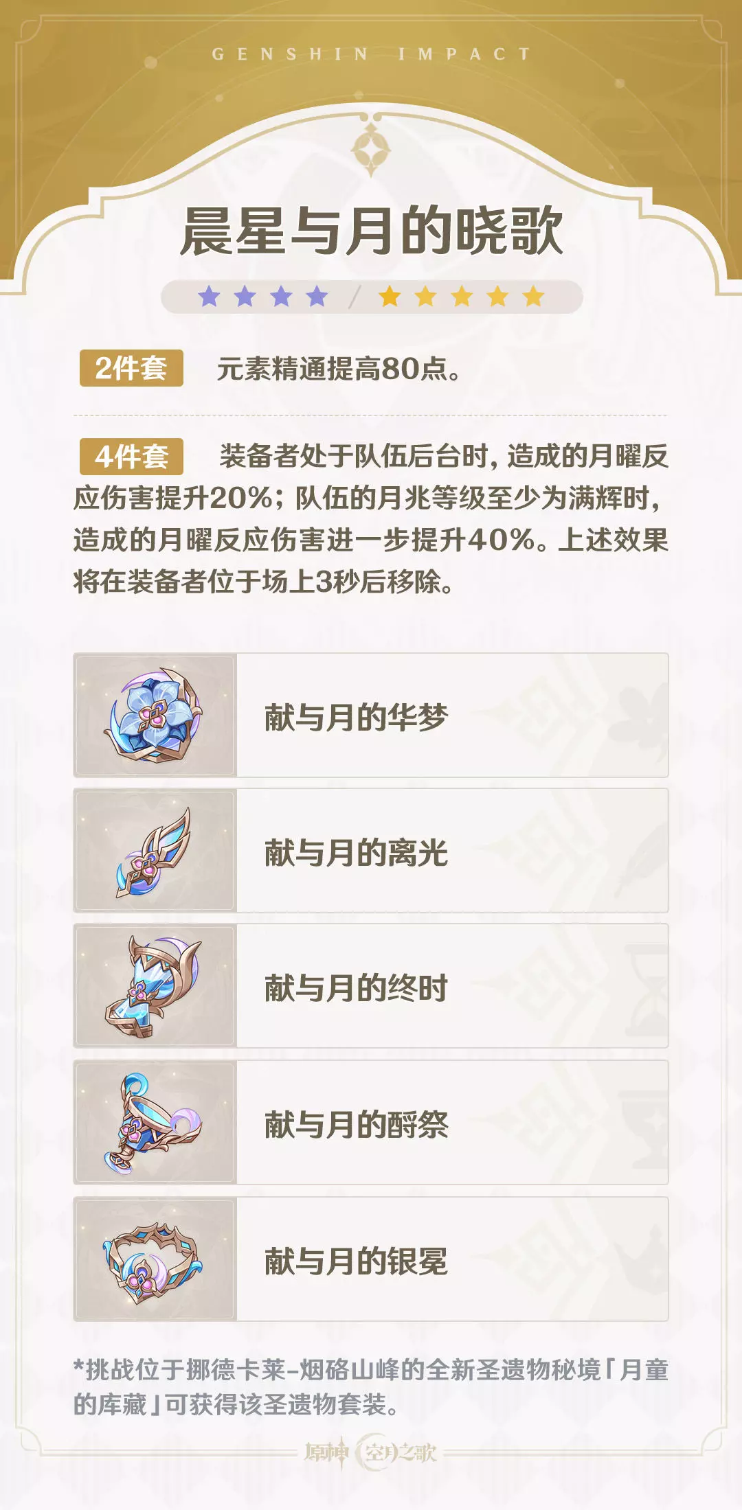 旅行者好!今天将为大家介绍「月之四」版本中的全新圣遗物套装,一起来看看吧~