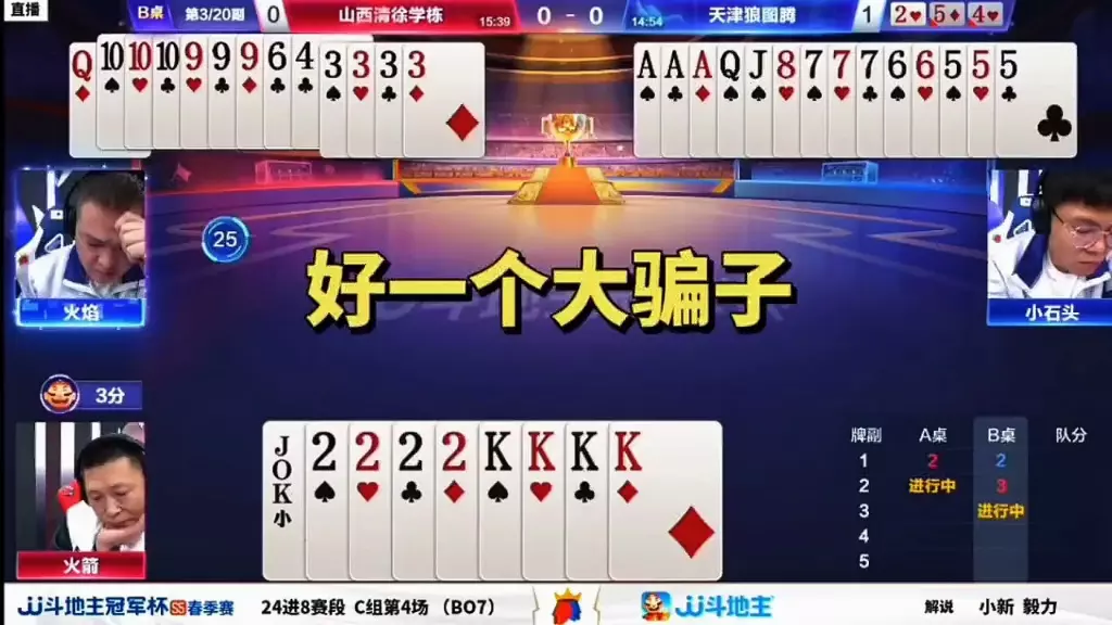 《JJ斗地主》北京源莱慧精英对阵山东好哥哥,宽容打输,天赐赢两炸。天赐,一流,老兵,七亿七,四条,宇峰,金鱼,小芳,阿国,飞鸟,旭旭宝宝视角