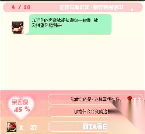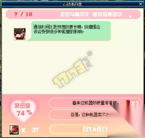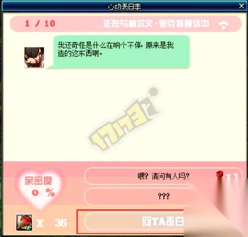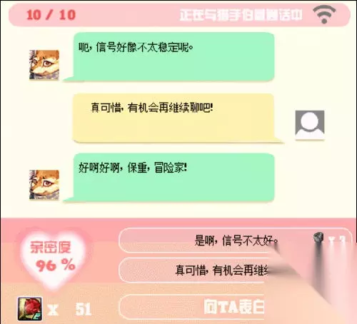 通信期间,使用3个玫瑰可与NPC进行对话,最多可进行10次。每次会按照答题正确/错误来获得不同亲密度。 当亲密度达到50%以上时,使用30个玫瑰可与NPC进行表白,表白时亲密度越高成功率越高(100%也概率失败)。