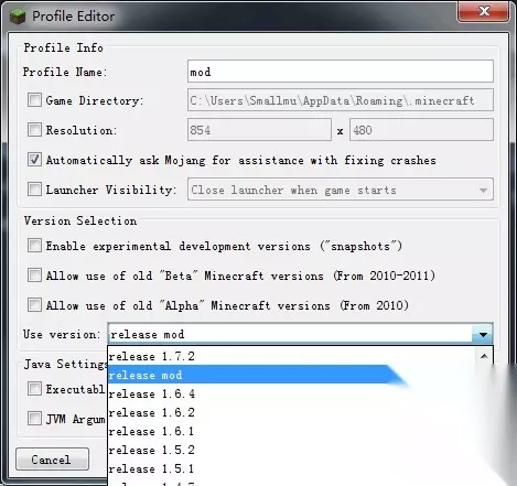 6、现在打开Minecraft启动器,创建或者选择对应的版本,启动游戏。 对于官方启动器的玩家,点击[New Profile]输入任何名称,在"Use version"的下拉菜单中选择release mod 然后点击Save Profile。其他启动器的玩家,在你的启动器界面游戏版本中选择mod即可。