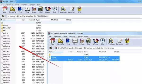 5、使用压缩软件将小地图.zip中的文件全部解压(拖入)mod.jar(使用压缩软件打开)文件中。删除META-INF文件夹。