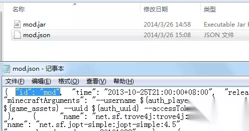 4、打开我们新建的版本文件夹,将1.7.2.jar(可能不显示.jar,总之是java文件)和1.7.2.json重命名为mod.jar(不显示.jar的命名为mod即可) 和mod.json,使用文本编辑器(记事本之类的)打开mod.json,更改"id":"1.7.2"为"id":"mod"。