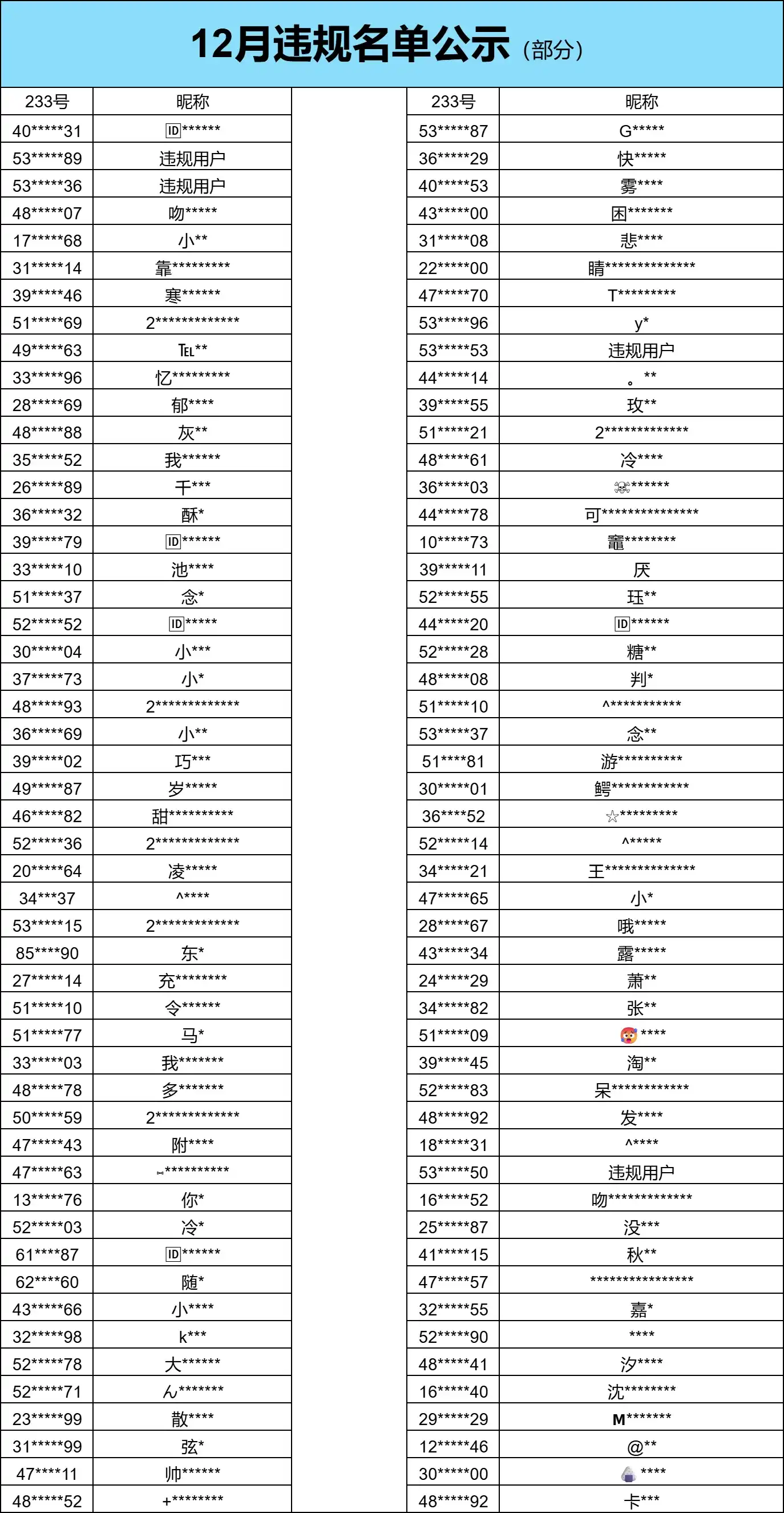12月一共处理3026位违规用户,我们对不礼貌的“坏孩子”给予惩戒。 对以上存在违规行为的用户,进行了封禁,禁言,取消参与的活动奖励等等 下列为2025年12月1日-2025年12月31日出现了违规情况的账号,希望大家引以为戒。 以下公示部分名单,以示警戒!