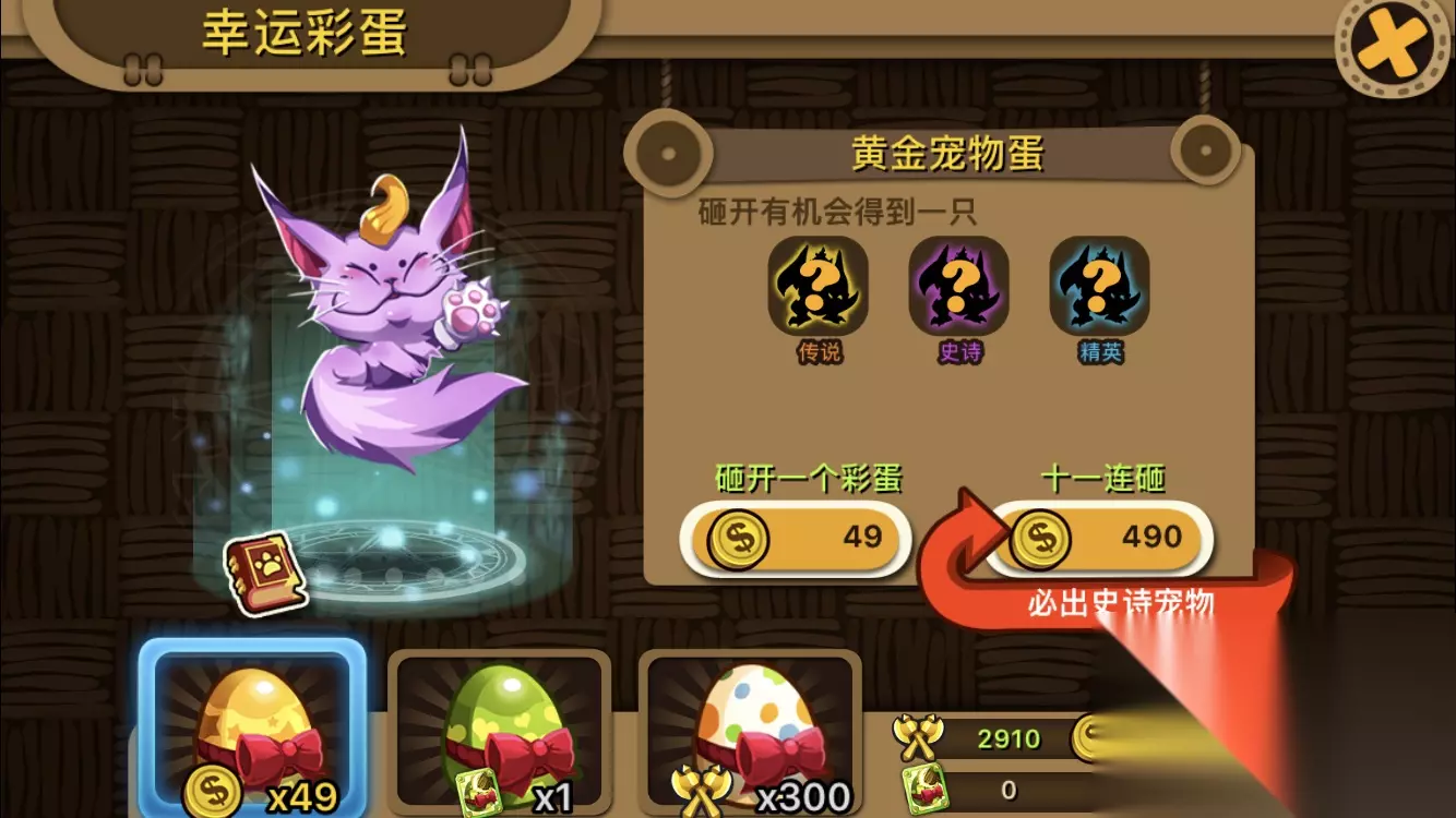 砸蛋 这个游戏一成不变的就是坑人的砸蛋了,十分的坑人与氪金,来个十连砸就是几百块钱。当然,普通玩家也可以不用充钱砸蛋,普通玩家可以通过活动、捕捉、兑换来收集高阶宠物。