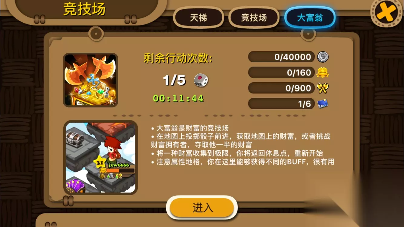 大富翁活动的开启: 这个活动是我最喜欢的一个玩法,大家在一个地图里相互争夺资源。跳到同一个格子就能和对方战斗,胜利就能抢夺对方一半资源,然后把他送回起点。地图上面还刷金箱子,踩到就能拿到10个金币。看到了就赶快抢吧,现在人很多,很热闹。