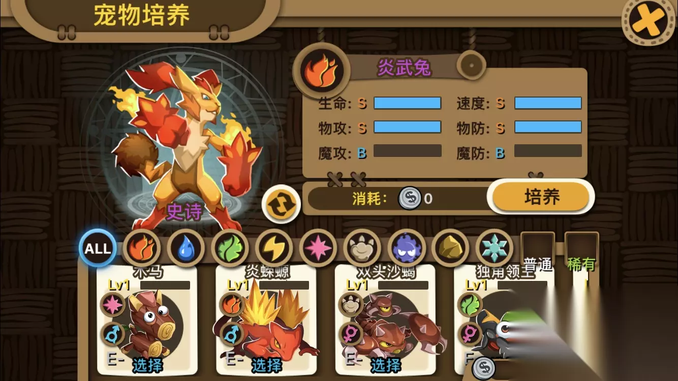培养代替了繁殖 到达15级后,我们会发现之前的繁殖功能没有了,史诗宠再也不能量产了。要获得S宠物必须通过培养系统。培养系统简单的说,就是让一只宠物吃掉其他宠物来提高属性。比较坑的是吃其他宠物的时候还要花银币,我攒的30多w银币瞬间花光才把火兔培养到B+,所以要攒好银币来培养宠物。吃一般的宠物加的不多,吃到史莱姆会加一项属性加很多,不过相应的花钱也多了。