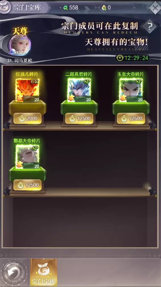 宗门宝库:宗门内战力最高的玩家会自动成为天尊,宗门宝库内会随机刷新出天尊所持有的仙将侍从,其他同宗门好友可进行购买,直接获得高品质仙将,这种福利待遇可是超高的