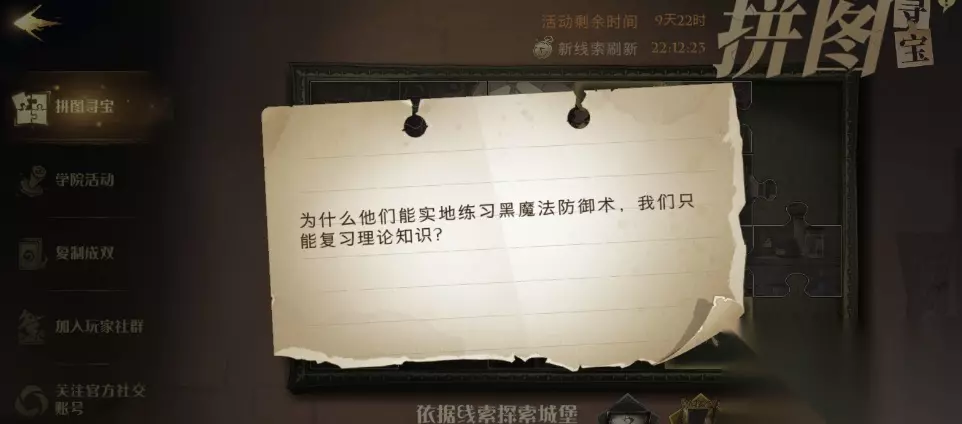 哈利波特魔法觉醒为什么他们能实地练习拼图在哪 一、拼图线索 为什么他们能实地练习黑魔法防御术,我们只能复习理论知识